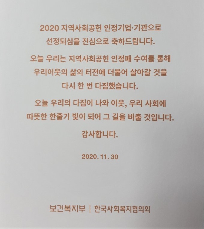 민들레의료사협, 2020 지역사회공헌 인정패 수여