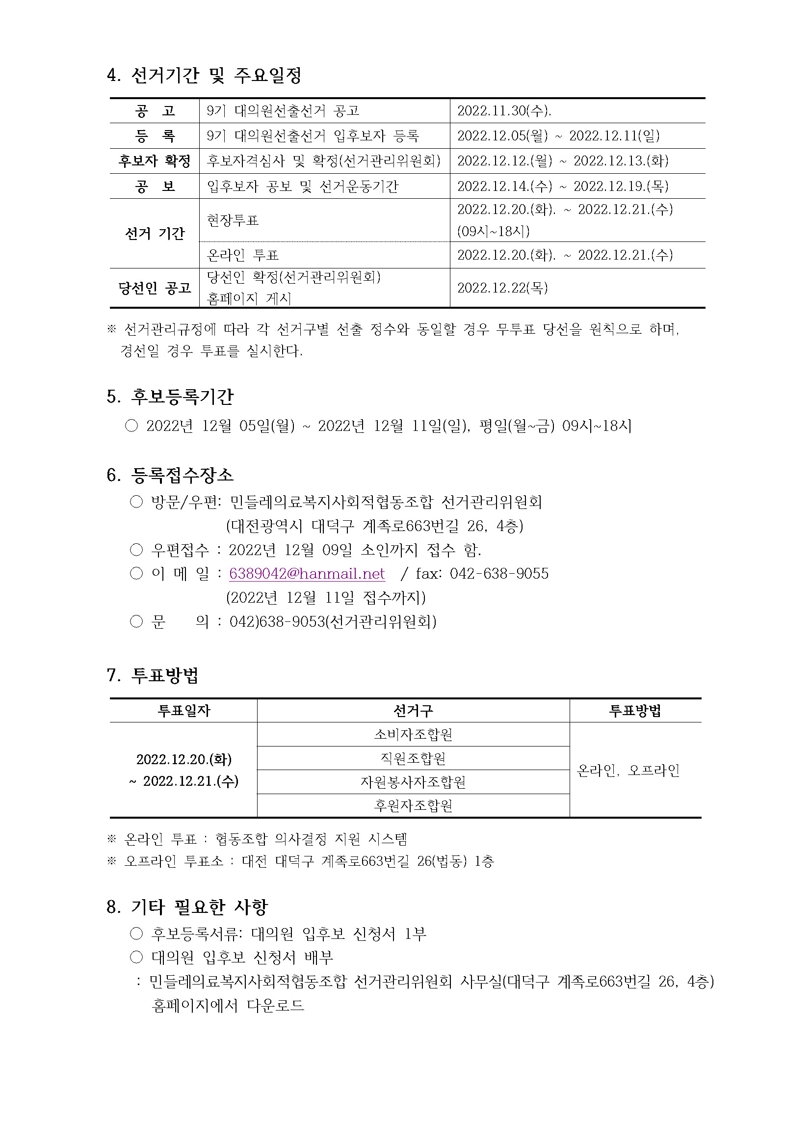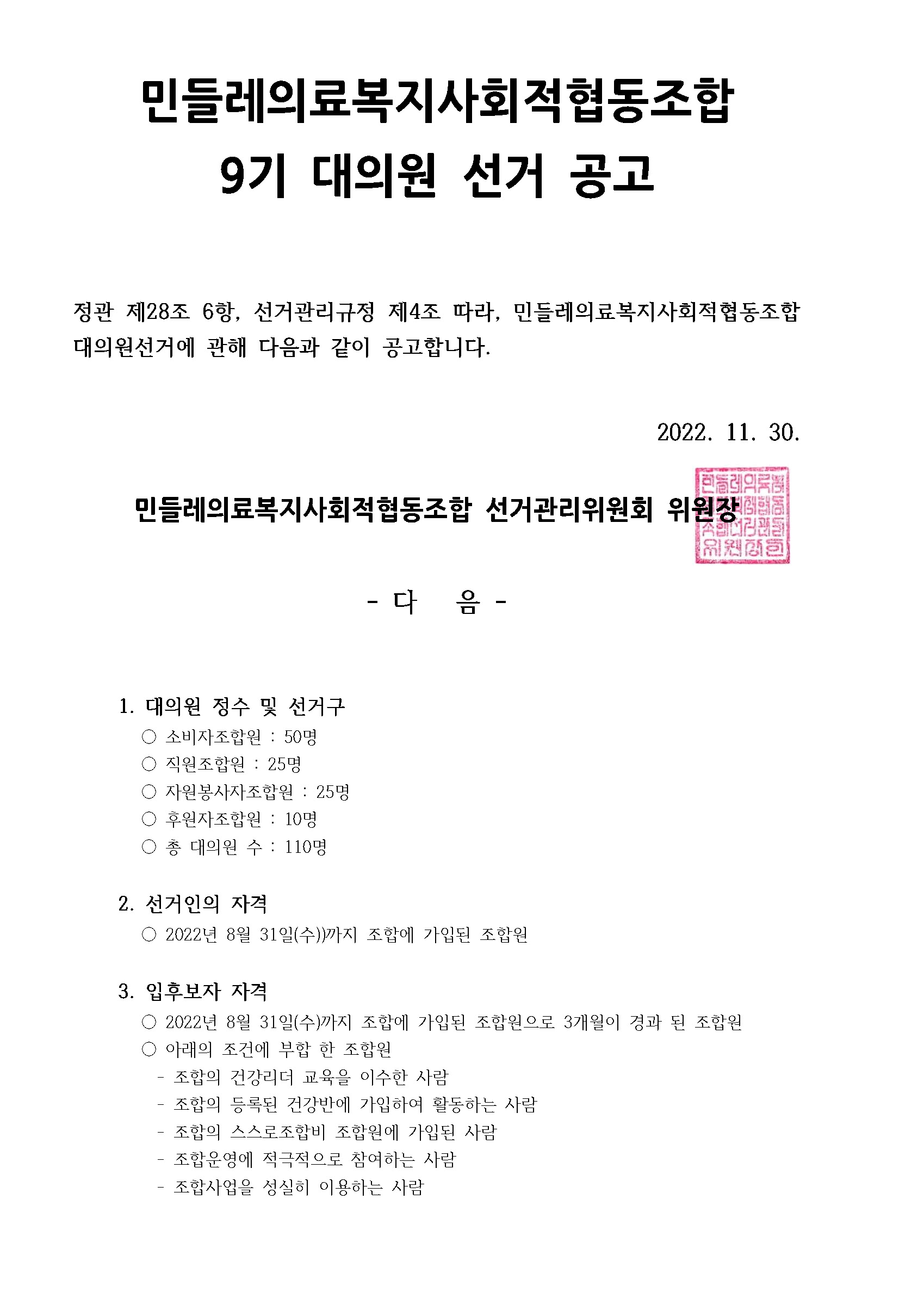 9기 대의원 선거 공고
