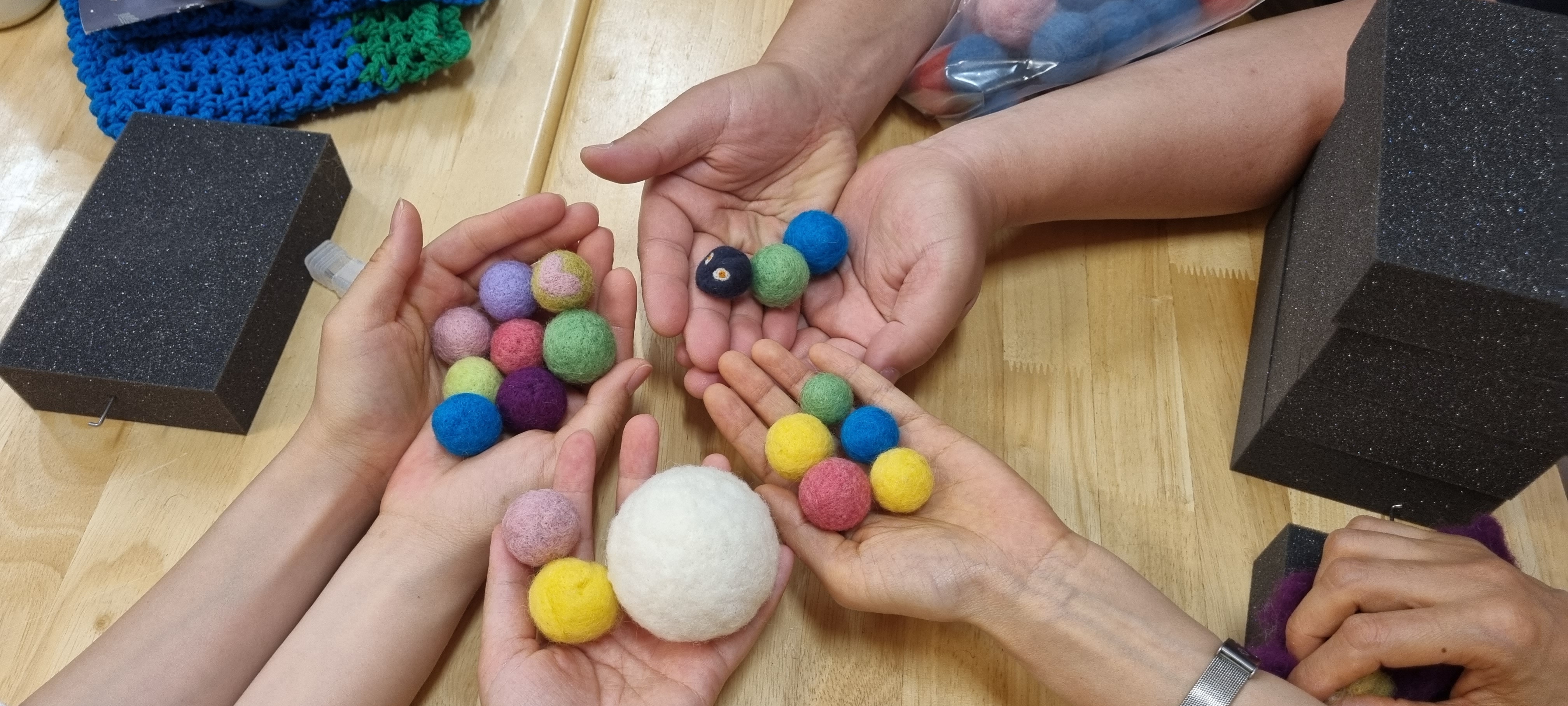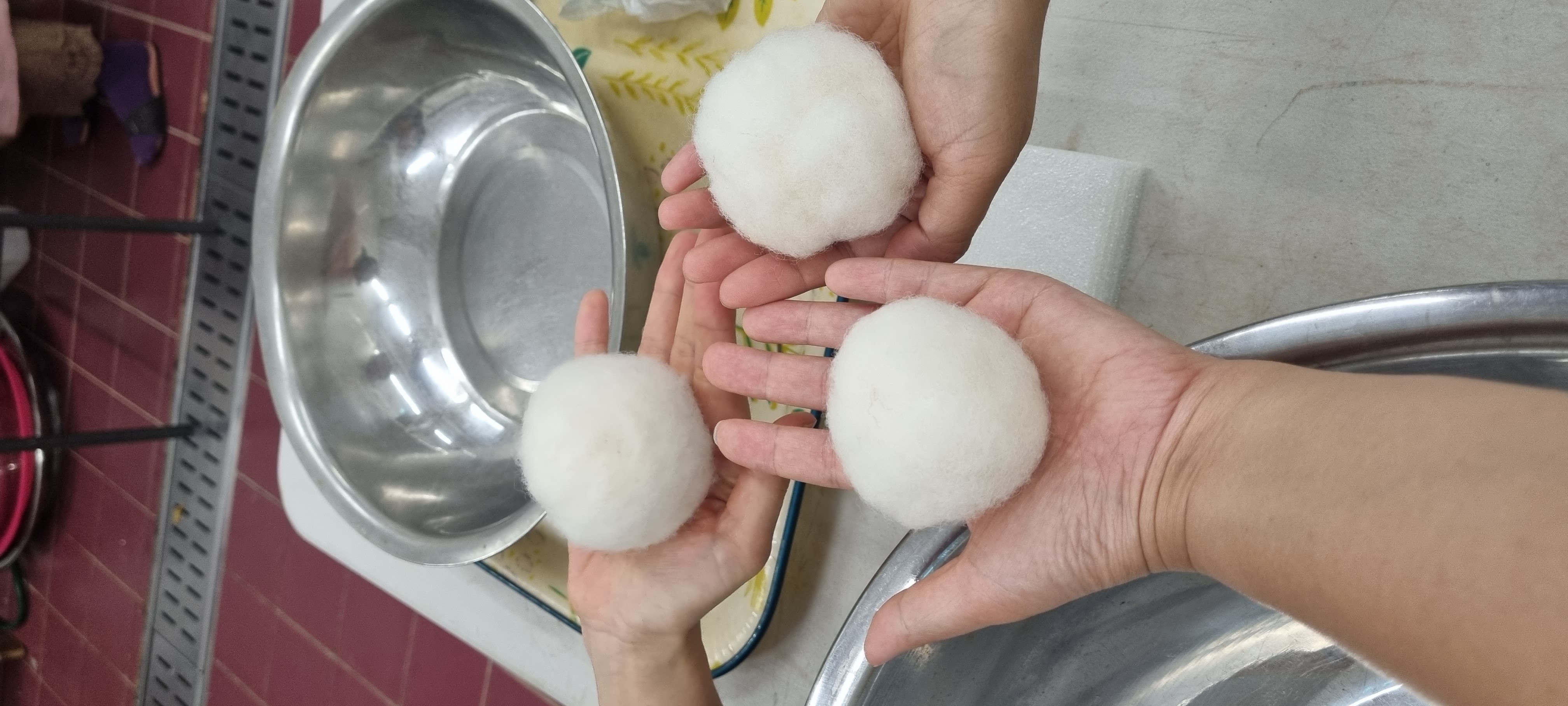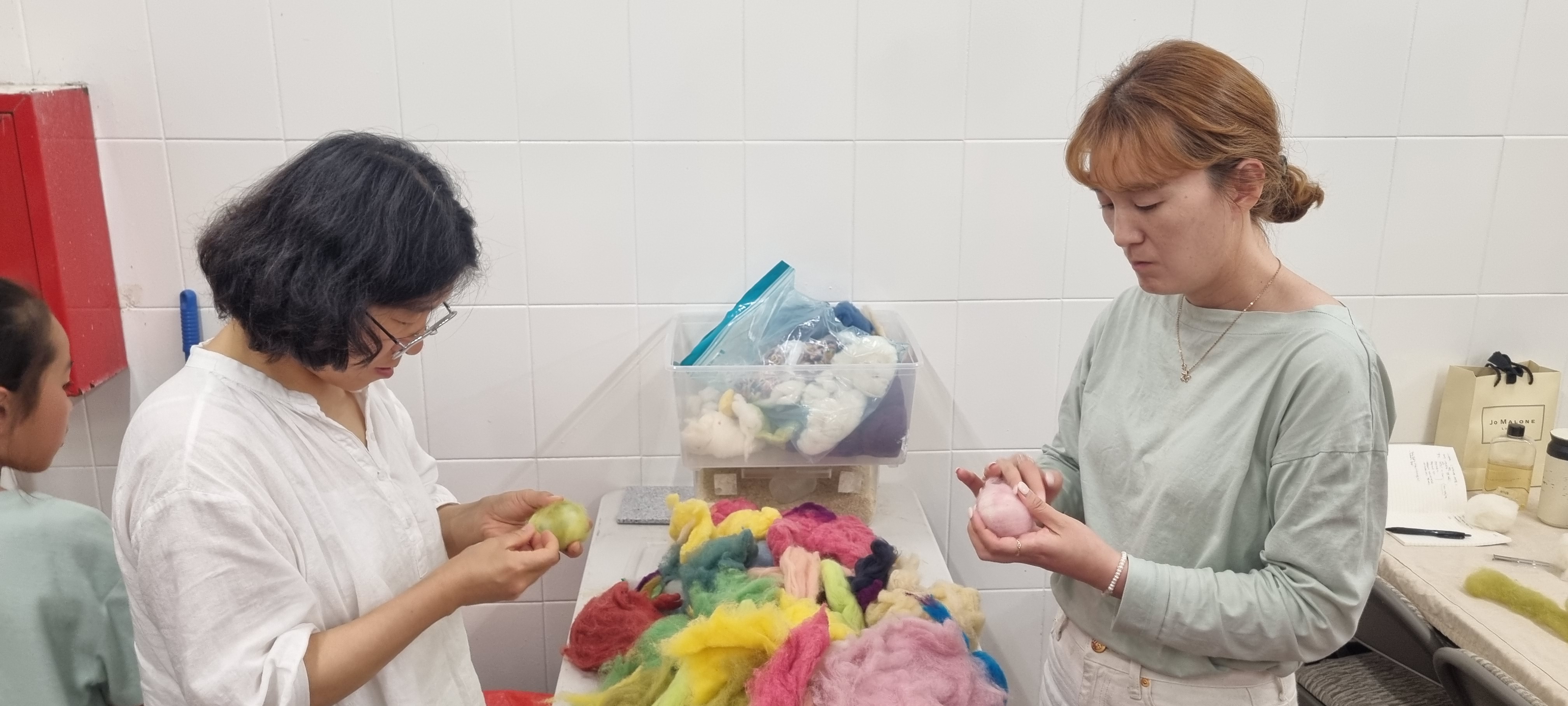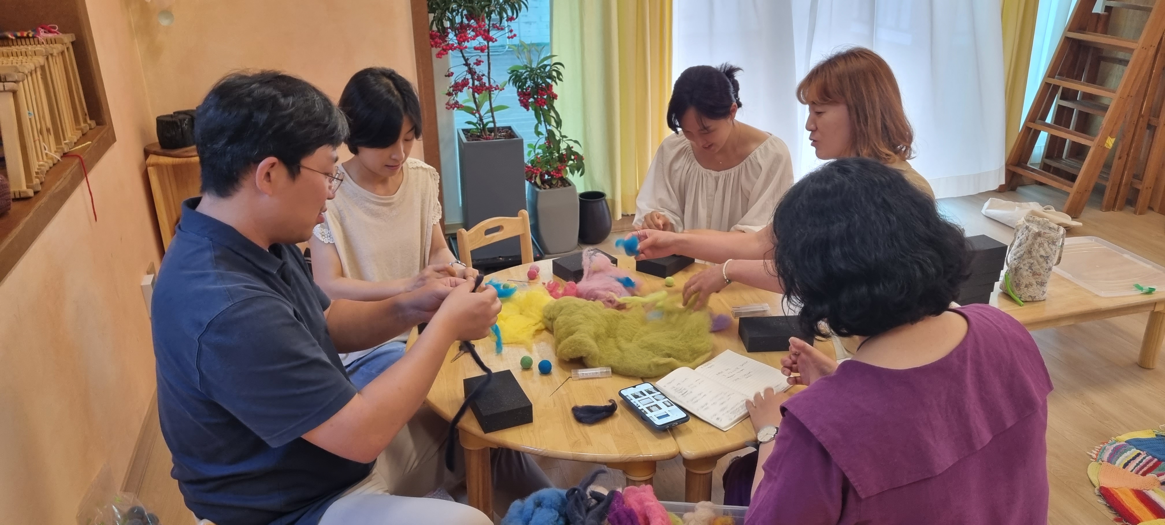 1.근황나누기 2.집에서 양모 공을 더 만든 경험 나누기 3. 바늘로 양모공 만들기 4.비눗물로 만드는 양모공보다 준비물이 간편해서 좋았다. 좀더 단단한 양모공 만들기가 가능했고, 양모 바늘로 양모를 찌를 때 아삭/뽁뽁/ 느낌이 신기하고 좋았다. 5.네트백 뜨기 준비물 배분